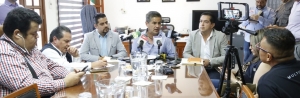 En la rueda de prensa participaron Gerardo Rafael Trujillo Vega, Coordinador de Administración y Finanzas, y los dirigentes sindicales César Íñiguez González y Alberto Mercado González.