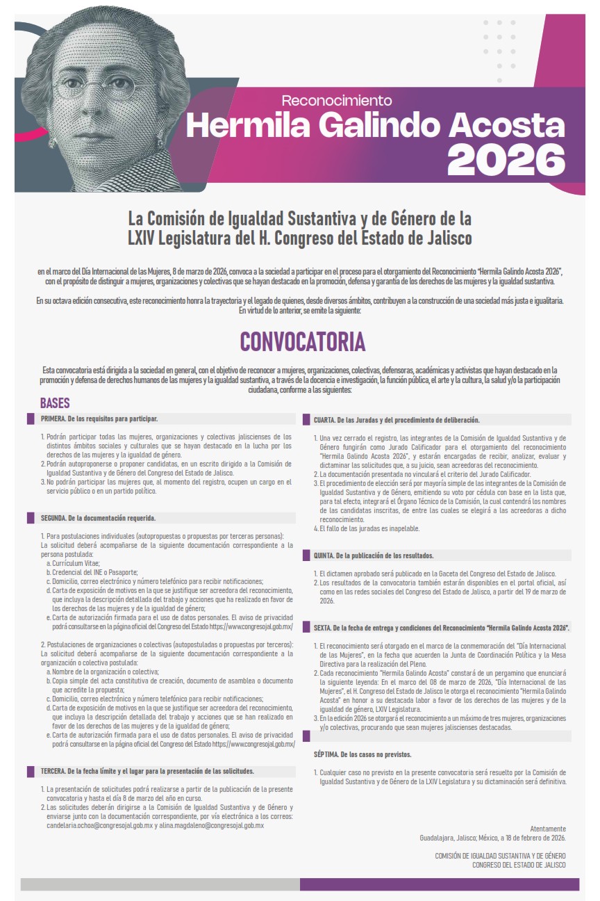 La Comisión de Igualdad Sustantiva y de Género de la LXIV Legislatura del H. Congreso del Estado de Jalisco, en el marco del Día Internacional de las Mujeres, 8 de marzo de 2026, convoca a la sociedad a participar en el proceso para el otorgamiento del Reconocimiento "Hermila Galindo Acosta" 2026, con el propósito de distinguir a mujeres, organizaciones y colectivas que se hayan destacado en la promoción, defensa y garantía de los derechos de las mujeres y la igualdad sustantiva.