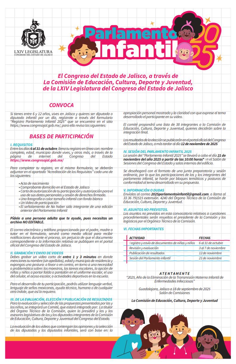 Si tienes entre 6 y 12 años, vives en Jalisco y quieres ser diputada o diputado infantil por un día, regístrate a través del formulario “Registro Parlamento Infantil 2025” que se encuentra en este sitio, para ello revisa las siguientes: